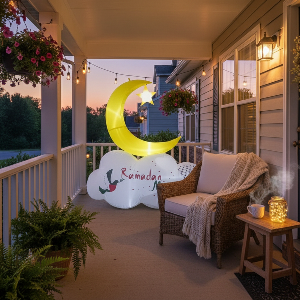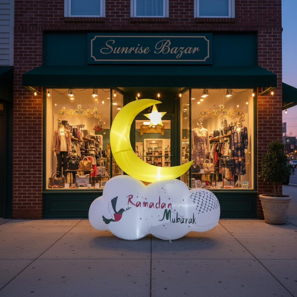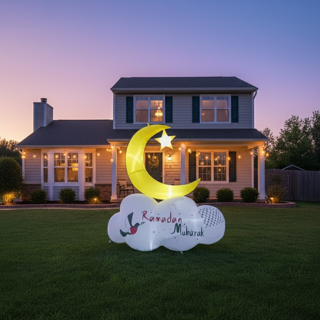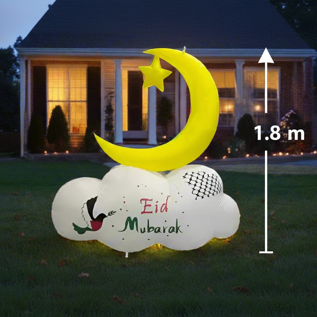 The Reversible Crescent Inflatable with Palestinian Pattern is a unique decoration for Ramadan, Eid, or any Islamic celebration. One side of the inflatable features Ramadan greetings, while the reverse side features Eid greetings. This inflatable is designed with the colors of the Palestinian flag and features the 'Kufiyah,' a widely recognized symbol of Palestinians. Made of weather-resistant material, it can be used both indoors and outdoors. Its bright and colorful design, illuminated by LED lights, is sure to draw attention and create a festive atmosphere during Ramadan and Eid. A built-in air blower keeps it inflated at all times.