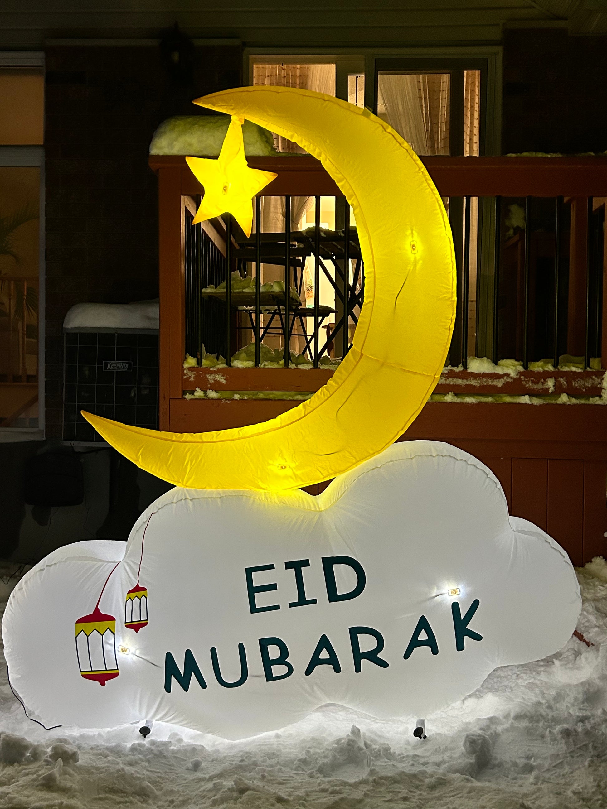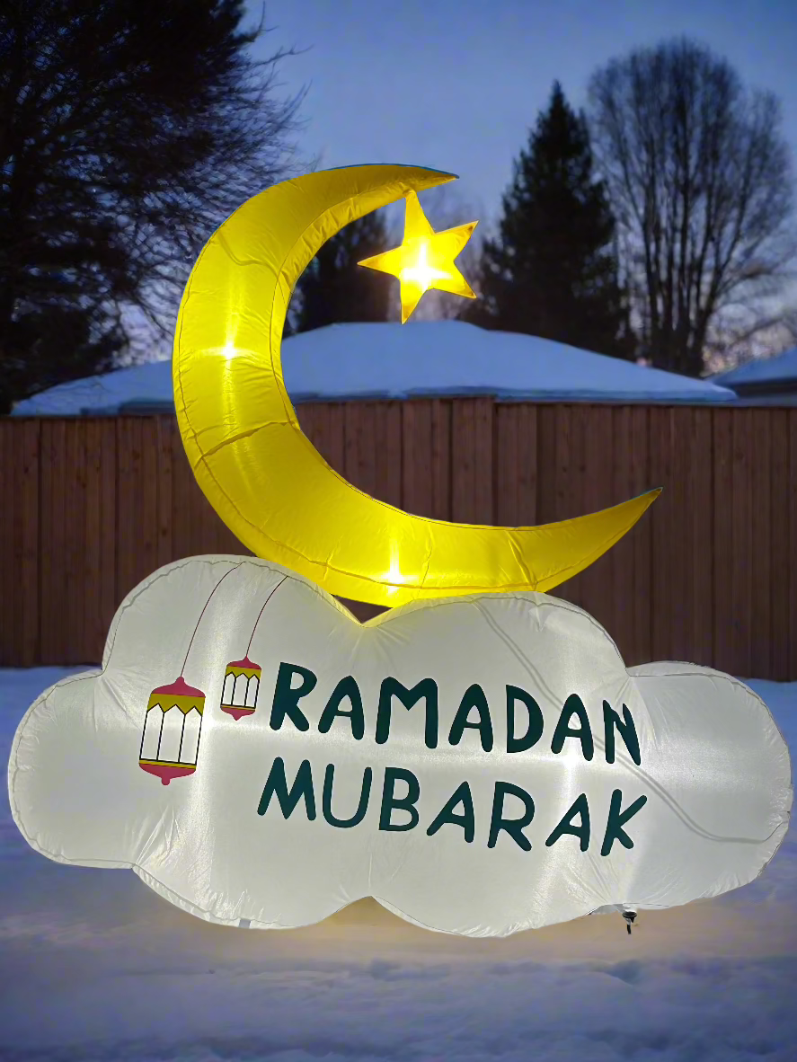 الهلال القابل للنفخ والمطبوع على الجهتين هو زينة فريدة من نوعها لشهر رمضان أو العيد أو أي احتفال إسلامي. يتميز أحد جوانب الهلال القابل للنفخ بتحية رمضان ، بينما يتميز الجانب الخلفي بتهنئة العيد. هذا الهلال مصنوع من مادة مقاومة للطقس ويمكن استخدامه في الداخل والخارج. من المؤكد أن تصميمه المشرق