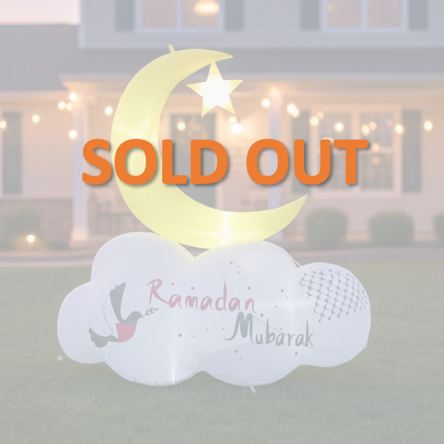 The Reversible Crescent Inflatable with Palestinian Pattern is a unique decoration for Ramadan, Eid, or any Islamic celebration. One side of the inflatable features Ramadan greetings, while the reverse side features Eid greetings. This inflatable is designed with the colors of the Palestinian flag and features the 'Kufiyah,' a widely recognized symbol of Palestinians. Made of weather-resistant material, it can be used both indoors and outdoors. Its bright and colorful design, illuminated by LED lights, is sure to draw attention and create a festive atmosphere during Ramadan and Eid. A built-in air blower keeps it inflated at all times.