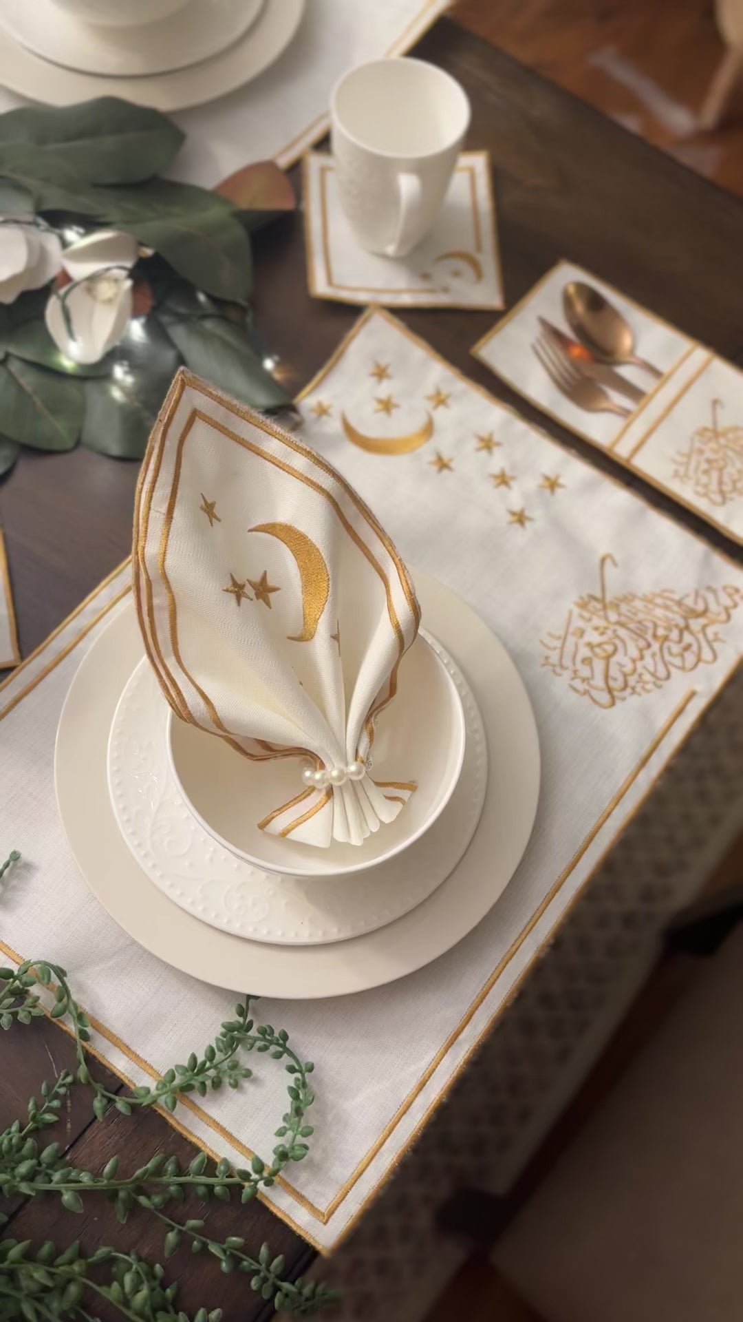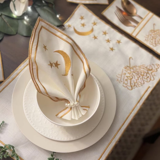 Each item is exquisitely embroidered with golden silk thread, adding a luxurious finish to your Ramadan table setting.