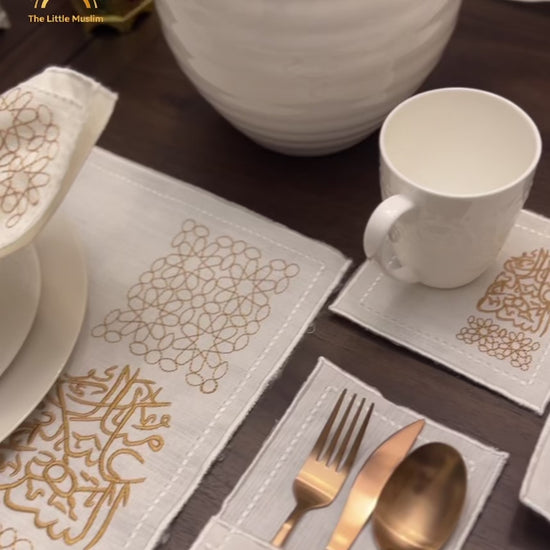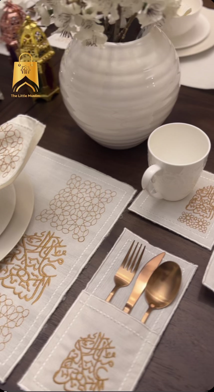 Each item is exquisitely embroidered with golden silk thread, adding a luxurious finish to your Ramadan table setting.